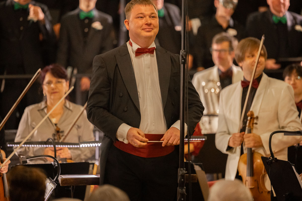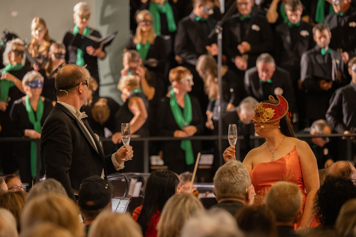 Während vom Orchester das Instrumentalstück „Erinnerung an Ernst oder Der Karneval in Venedig“ von Johann Strauß (Vater) gespielt wird, veranschaulicht unserer Vorsitzender Stefan Hoffmann mit Witz und Charme die verschiedenen Themen der Komposition auf eindrucksvolle Weise per Pantomime und mit einem Korb voller Plüschtieren. Besonders bei unseren jüngsten Besuchern führt diese Einlage zu herzhaften Lachattacken. Ebenso beweist Tobias Hagge mehrfach außerordentliches Schauspieltalent. Während des Abends überzeugt er in verschiedenen Rollen, ob als verführerische Fliege im Fliegenduett aus der Operette „Orpheus in der Unterwelt“ von Jacques Offenbach, als schmachtender Danilo aus der Operette „Die Lustige Witwe“ von Franz Lehár oder in der grandiosen Darbietung des Tangos der alten Dame „I am so Easily Assimilated“ aus Leonard Bernsteins Operette „Candide“ im goldenen Paillettenkleid und in High Heels. Er macht stets eine sensationelle Figur, die begeistert.