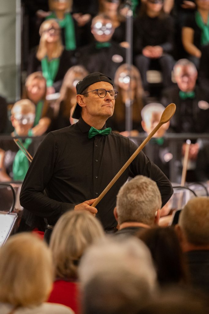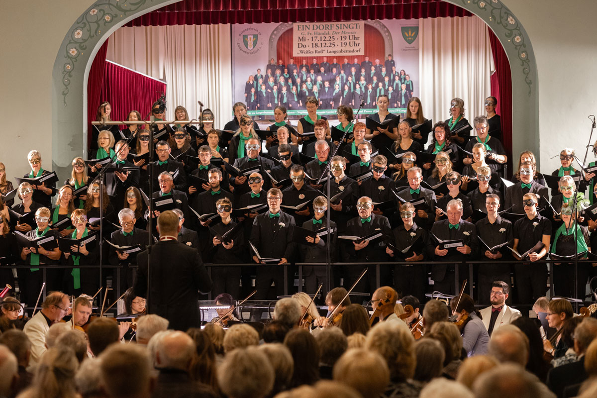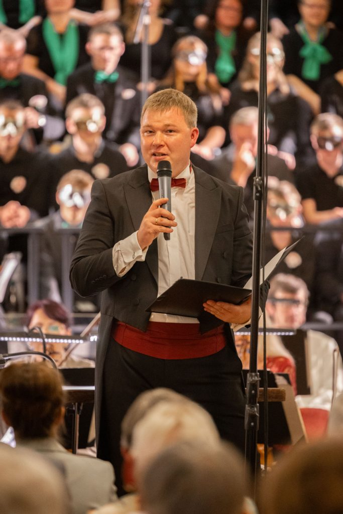 Erneute Unterstützung erhielt unser Chor zudem vom Schulchor des Gymnasiums „Alexander von Humboldt“ Werdau. Der Schulchor wurde 2021 durch eine Kooperation des Gymnasiums mit dem Gesangverein zu Langenbernsdorf e. V. gegründet und wird seither von Andrea Gralla und Michael Pauser geleitet. Die knapp 40 jungen Stimmen verstärkten unseren Chor bereits zu verschiedenen Anlässen, wobei sich die Zusammenarbeit stets sehr angenehm gestaltet. In diesem Jahr gab es aber auch einige Premieren. So findet das Projekt zwar unter dem Dirigat von Michael Pauser statt, allerdings nicht mehr in seiner Funktion als unser Liedermeister. Diese hat er bereits im April, nach 16-jähriger Arbeit in diesem Amt, an seinen Nachfolger Thomas Lohri abgegeben. Seither leitet Thomas die Proben und alle musikalischen Geschicke des Vereins erfolgreich und mit großem Engagement. Michael hingegen wird dem unseren Verein zu unserer großen Freude zumindest teilweise erhalten bleiben. Auch nach seinem Amtsantritt als Orchesterdirektor der Vogtland Philharmonie Greiz/Reichenbach im Oktober 2024 dürfen wir damit rechnen, dass er das hauptsächlich durch ihn ins Leben gerufene Projekt „Ein Dorf singt“ weiterhin dirigieren wird. Gewohnt wortgewandt und unterhaltsam führt er durch das Programm und versorgt die Zuschauer mit allerlei interessanten Informationen zu Komponisten und Inhalten der unterschiedlichen Musikstücke.