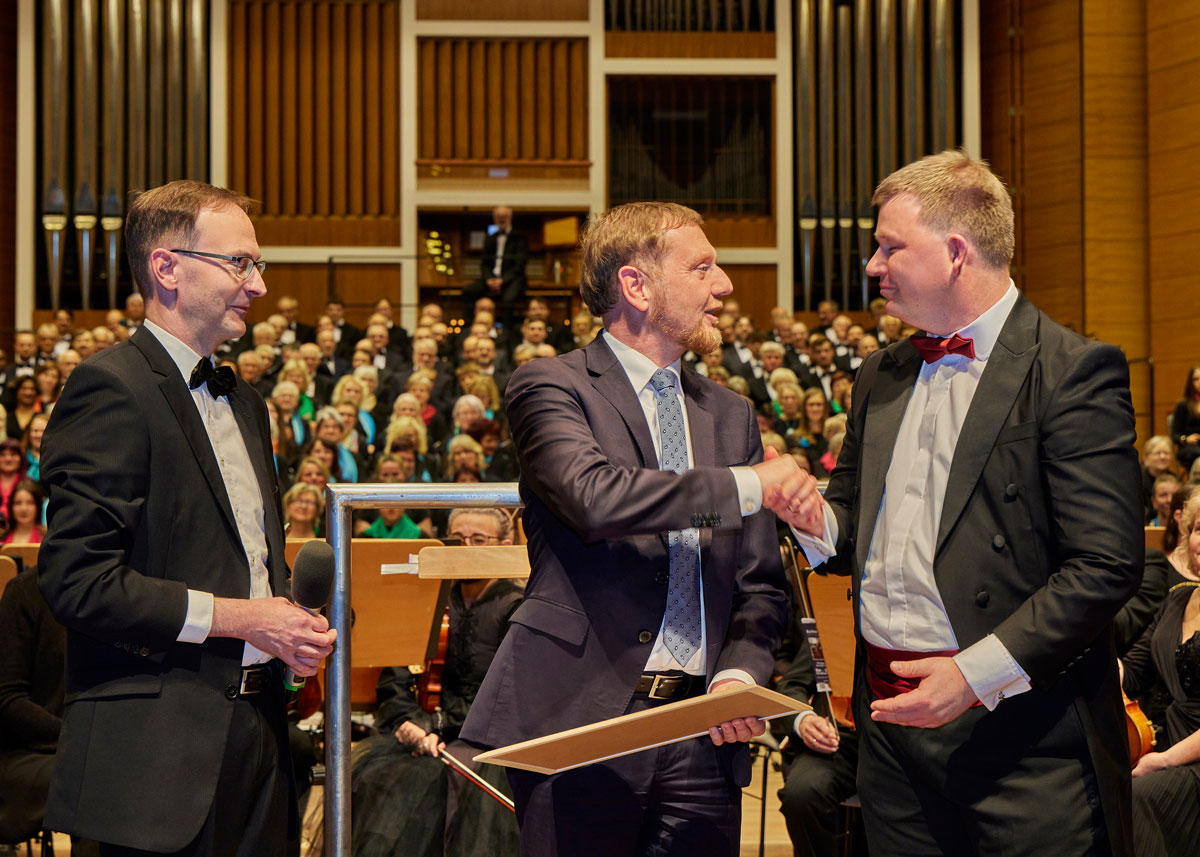 Festkonzert zum Kulturhauptstadtjahr mit fast 500 Mitwirkenden in der ausverkauften Stadthalle Chemnitz am 15.11.2025 in Anwesenheit von Ministerpräsident Michael Kretschmer.